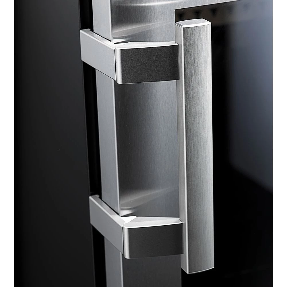 Sort kabinet med højrehængt glasdør med rustfri ramme og selvluk.