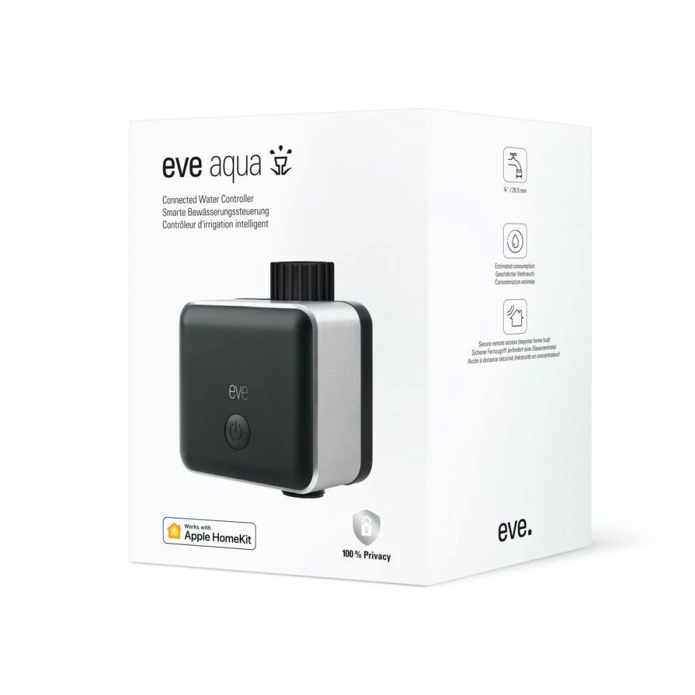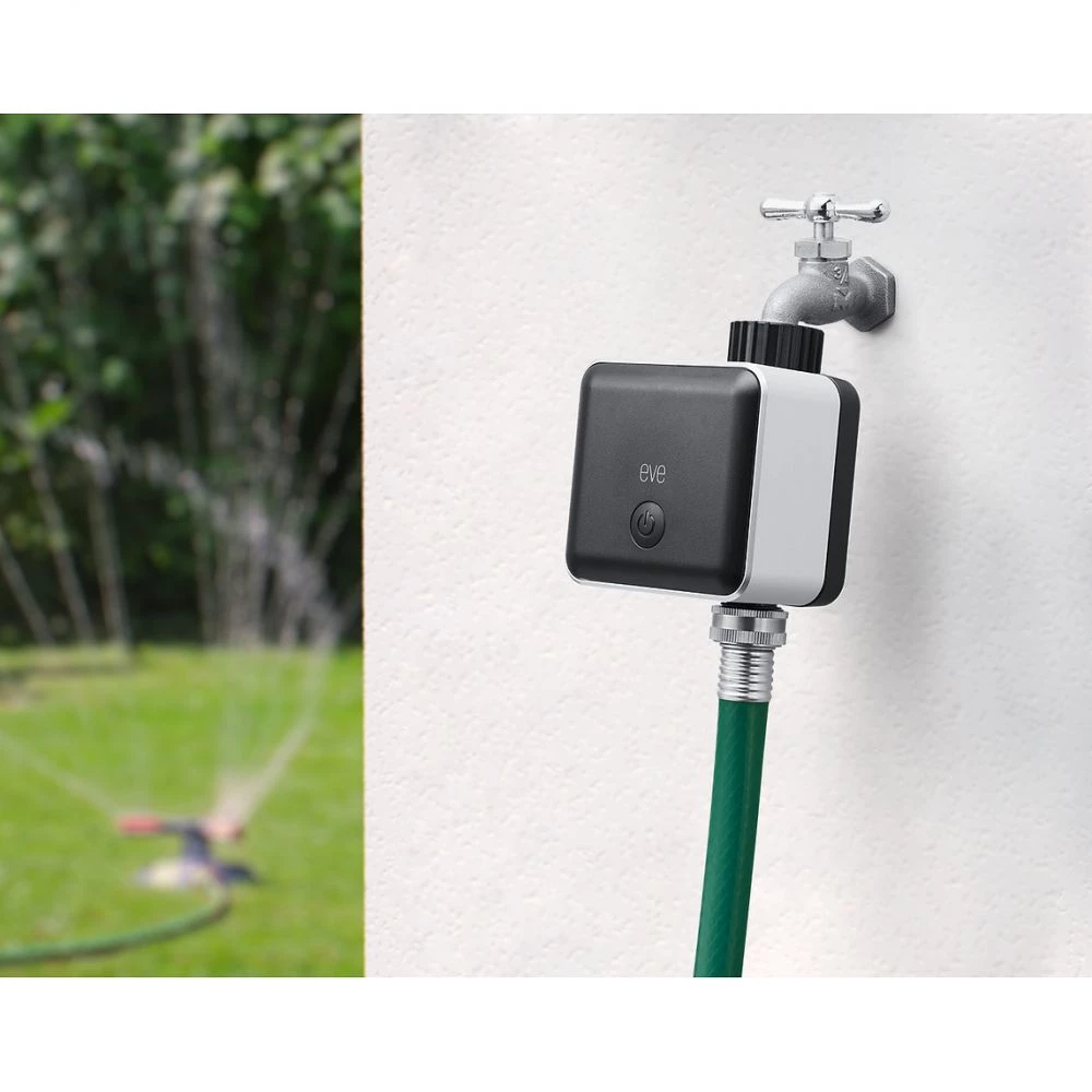 Eve Aqua er et intelligent vandingssystem, hvormed du kan automatisere afvanding af haven, græsplænen, bedet, drivhuset eller orangeriet. Som det er tilfældet for Eve-seriens øvrige produkter, kontrolleres Aqua via den energibesparende kommunikationsprotokol Bluetooth Low Energy.