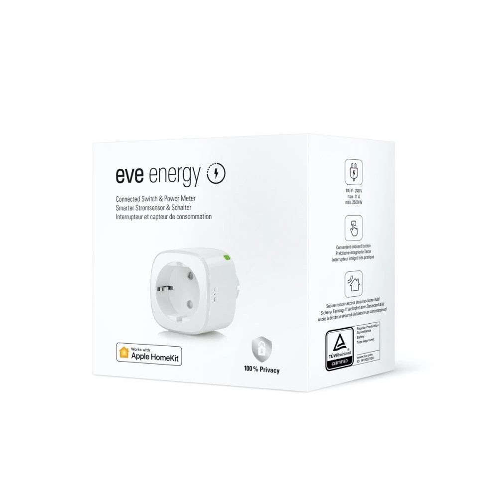 Få et bedre overblik over dit hjems energiforbrug med Eve Energy og den medfølgende app på din iPhone, iPad eller iPod touch. Se med det samme, hvor meget energi dine enheder bruger, og tænd eller sluk for dem med et enkelt tryk eller ved hjælp af Siri.