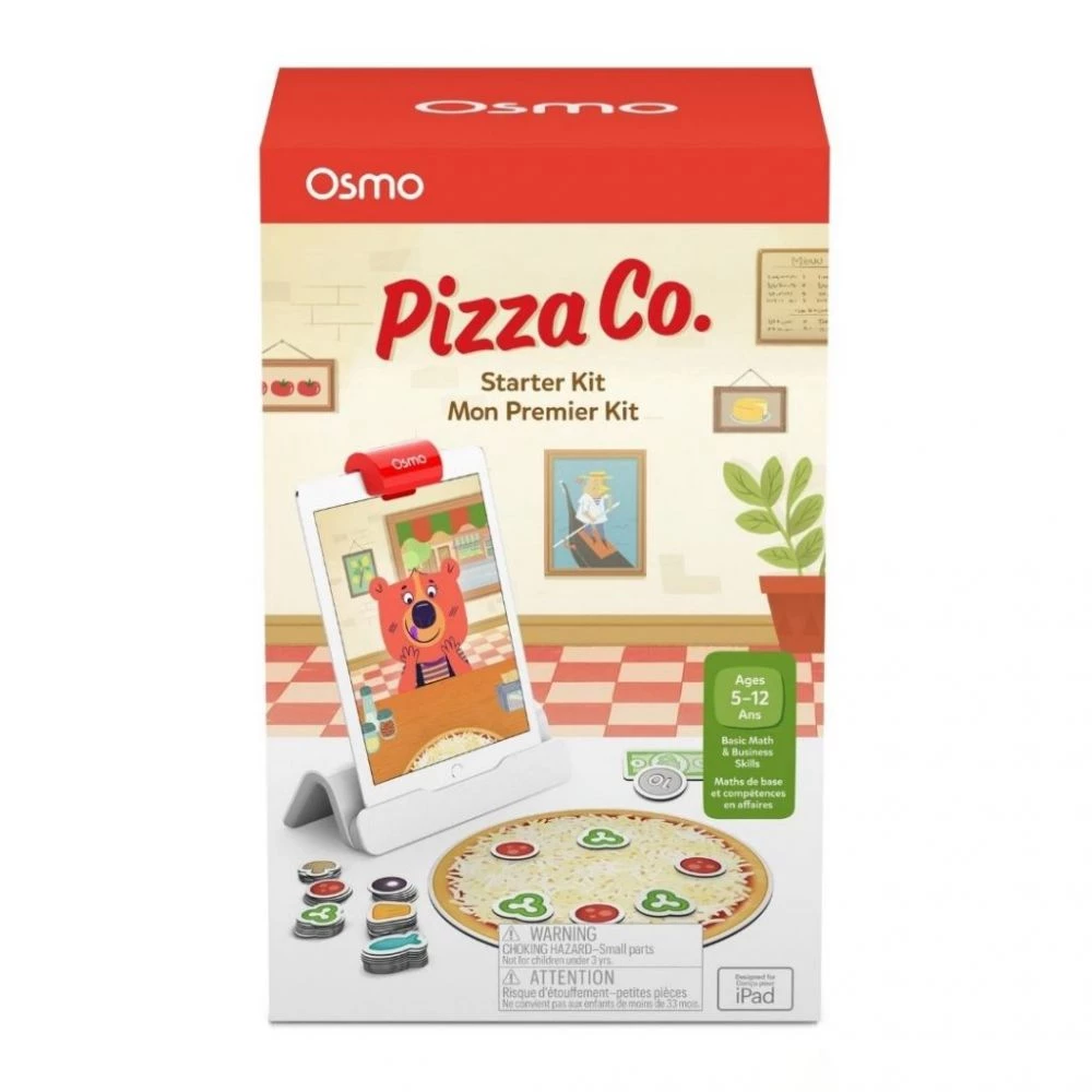 Starter Kit inkluderer: 1 Osmo-base til iPad, Pizza Co.-spilapp, Pizza-bakke, Toppings og Money-fliser og stabelbar opbevaring. iPad kræves for at spille.
