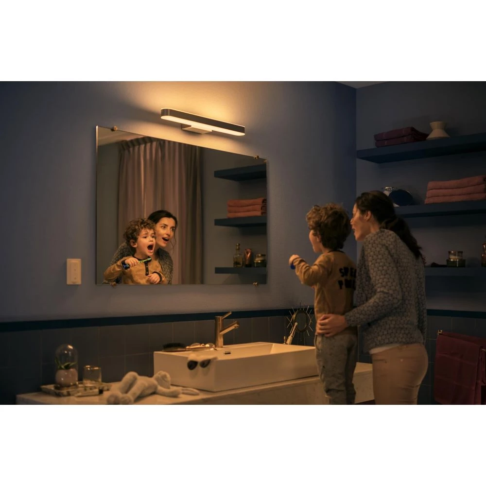 Anvend denne Philips Hue White Ambiance Adore spejlbelysning i dit badeværelse og oplev, hvordan den hjælper dig med at få energi, koncentrere dig, læse og slappe af. Med lysdæmperkontakten kan du nemt skabe den rigtige belysning til enhver lejlighed.