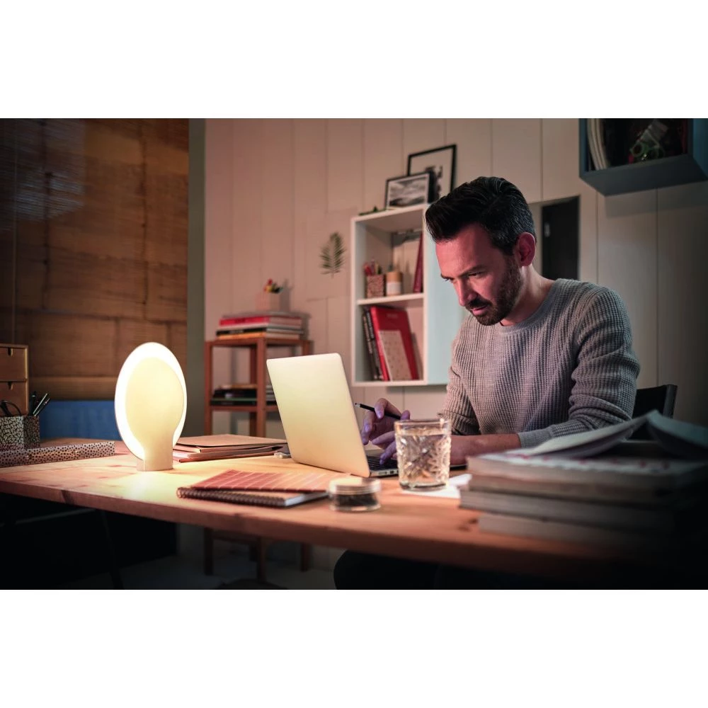 Med Philips Hue-bordlampen med hvid stemningsbelysning i hjemmet kan du nemt styre lysforholdene til alle dagens gøremål. Brug lysdæmperkontakten til at indstille lyset korrekt, så du kan slappe af, læse, koncentrere dig og få fornyet energi.