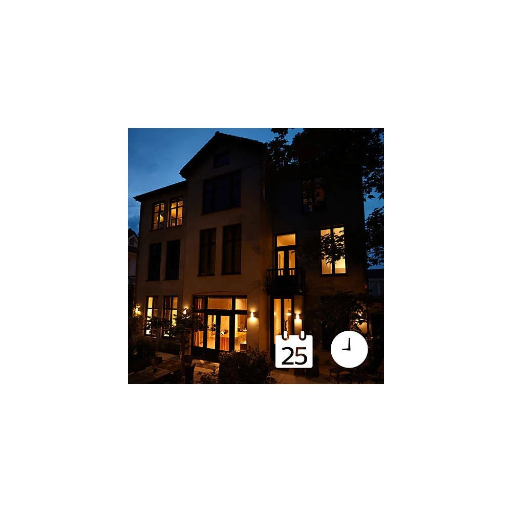 Armaturet tændes eller slukkes når du enten kommer hjem eller går hjemmefra. Du kan desuden indstille en timer, som styrer om lampen skal tændes eller slukkes på bestemte eller tilfældige tidspunkter. Via en app på din onlineopkobling kan du styre hele din hjemmebelysning.